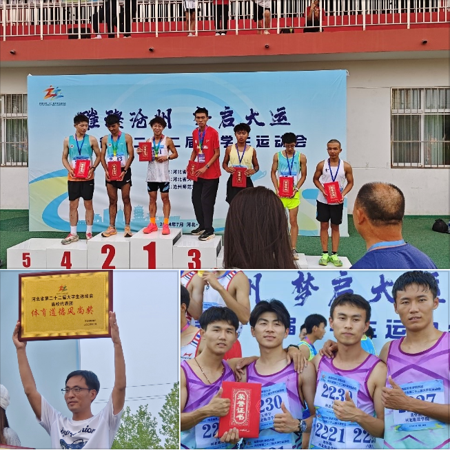 近日,河北省第二十二届大学生运动会田径比赛及河北省大学生篮球联赛圆满落幕。在这两场激烈的体育赛事中,我校学子奋勇拼搏,凭借着坚韧的毅力和出色的团队协作,再创佳绩,为学校增添了光彩。在大学生运动会田径比赛中,我校田径队取得了10000米第八,4×400米第六的好成绩,在篮球联赛中我校篮球队获得了第三名的好成绩,并分别获得“体育道德风尚奖”。