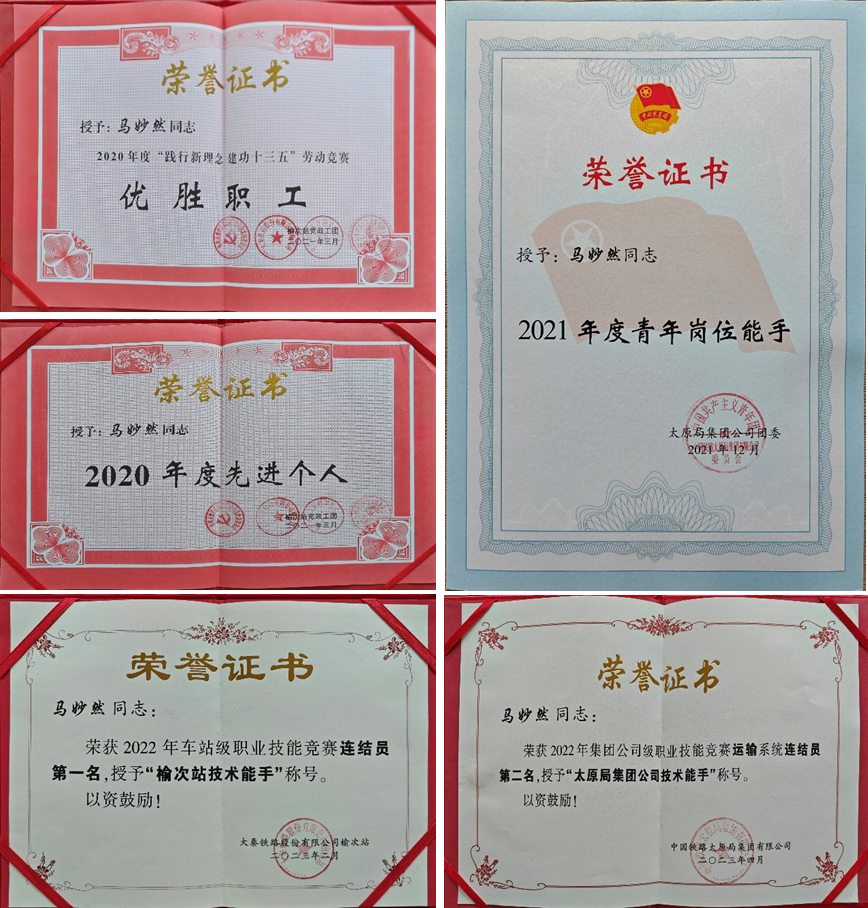 2016年的金秋,马妙然带着对铁路的向往踏入河北轨道运输职业技术学院,在铁道交通运营管理专业的课堂上埋下梦想。三年斩获“三好学生”“院级奖学金”“优秀学生会干事”等多项荣誉,校园生活见证着他的成长,让他懂得“责任”二字的分量,也为他铺就了通向铁路事业的星光大道。马妙然2019年毕业分配到太原局集团公司榆次站修文站,入路后他以“背规狂人”之名惊艳全场,连年包揽榆次站车站技能竞赛冠军,2022年更在集团比武中摘银,成为榆次站“技术状元”。