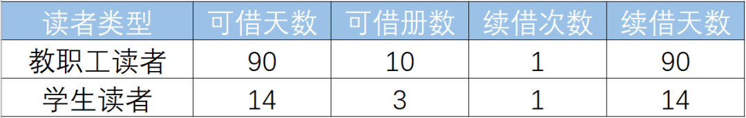 借阅册数、期限:全校师生分为教职工读者和学生读者两种类型,借阅册数和期限根据读者类型不同有所区分。