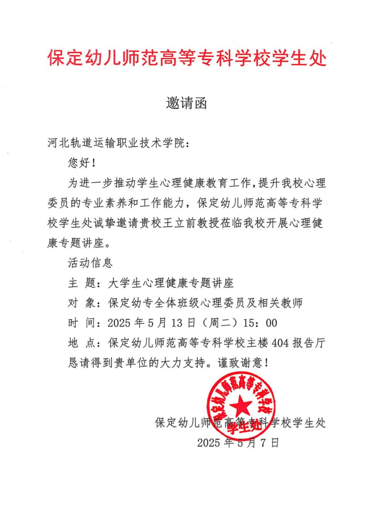 2025年受邀在保定幼儿师范高等专科学校开展心理健康专题讲座